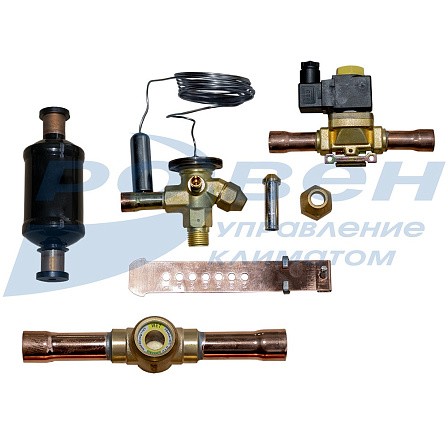 В системах с компрессорно-конденсаторными блоками на линии нагнетания устанавливаются элементы «Соединительного комплекта для ККБ». Непосредственно перед секцией фреонового охлаждения (испарителем) рекомендуется установка соленоидного клапана и ТРВ (терморегулирующего вентиля) или ЭРВ (электронно регулирующего вентиля)